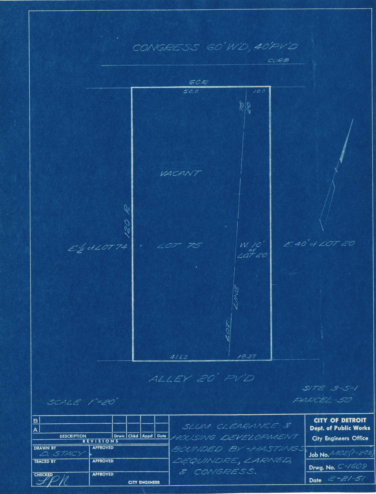 Plot plan for property located on Congress, parcel 50, site 3-S-1. Recorded on blueprint: "Slum clearance & housing development bounded by Hastings, Dequindre, Larned & Congress."