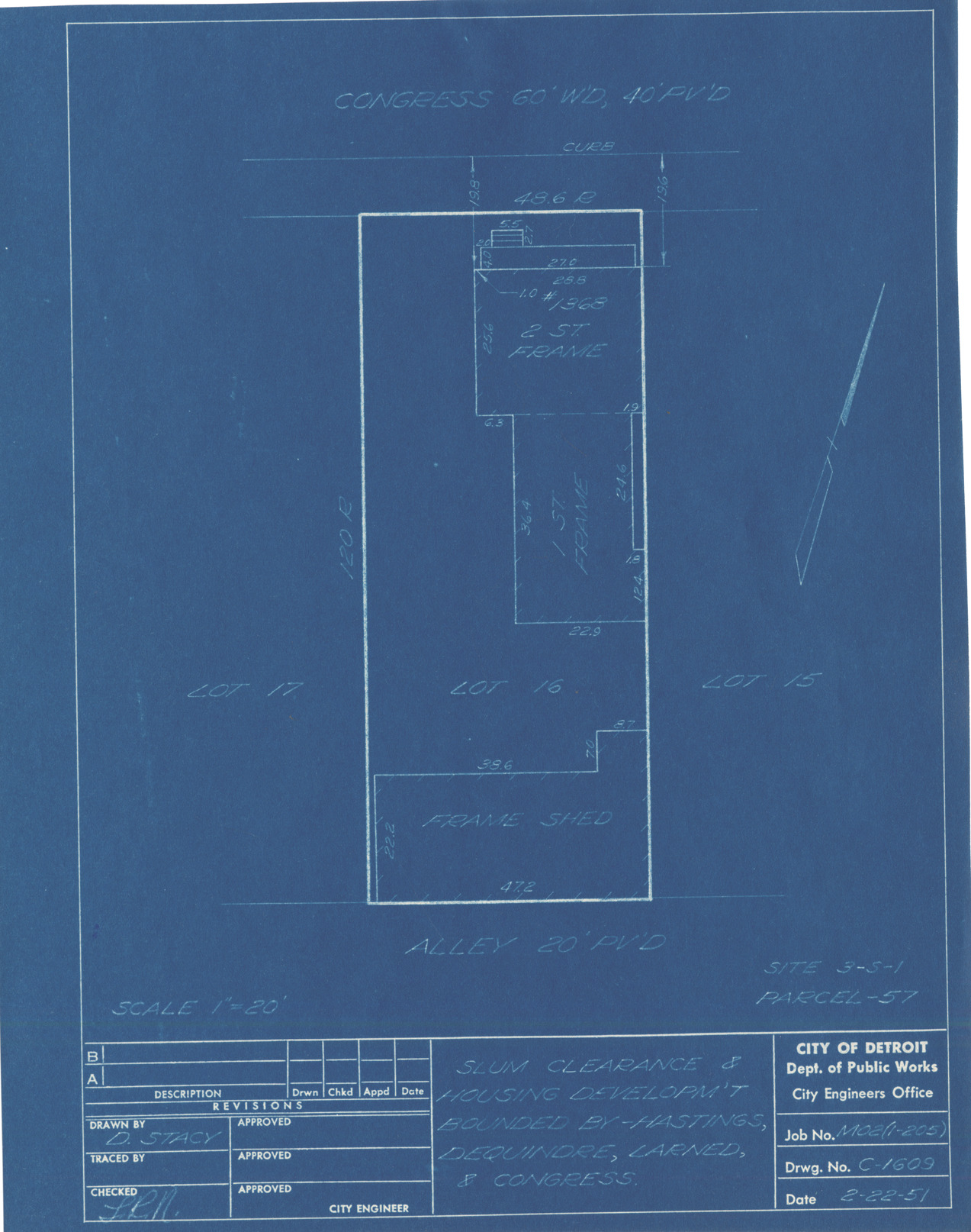 Plot plan for property located on Congress, parcel 57, site 3-S-1. Recorded on blueprint: "Slum clearance & housing development bounded by Hastings, Dequindre, Larned & Congress."