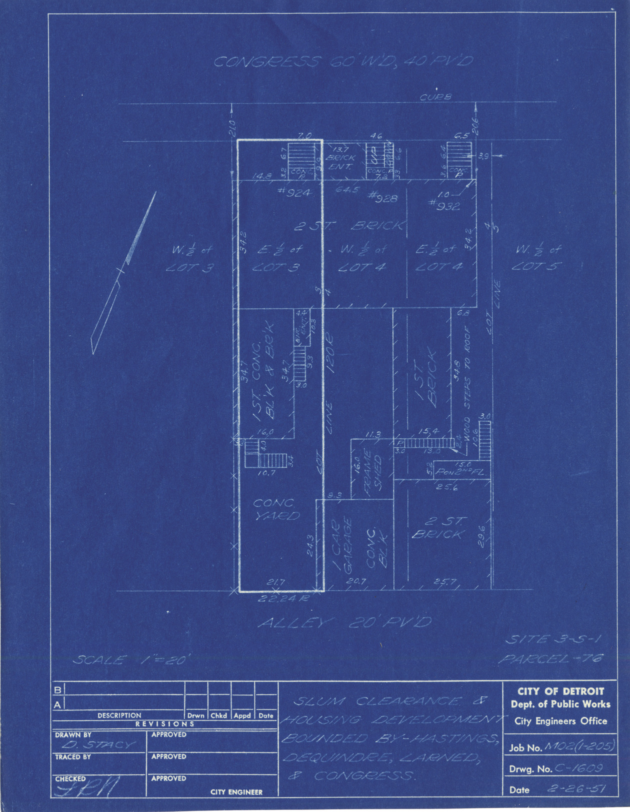 Plot plan for property located on Congress, parcel 76, site 3-S-1. Recorded on blueprint: "Slum clearance & housing development bounded by Hastings, Dequindre, Larned & Congress."