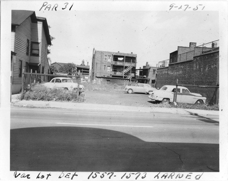 One-story brick building adjacent to two-story brick building on corner, located at 1573 E. Larned, parcel 31, in the area bounded by Hastings/Dequindre/Larned/Congress, site 3-S-1. Fence around roof of 1573. Viewed from across street. Back view of buildings on next street, including apartment building with back stairway. Handwritten on front: "Par. 31, vacant lot bet. 1557-1573 Larned, 9-27-51."