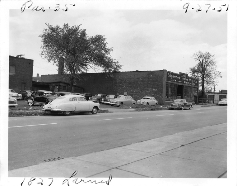 One-story brick building located at 1827 E. Larned, parcel 35, in the area bounded by Hastings/Dequindre/Larned/Congress, site 3-S-1. Sign on building reads "1827, Edgewood Tool & Mfg. Co., dies, stampings." Viewed at an angle across street. Cars parked on street and in neighboring lot. Other buildings visible. Handwritten on front: "Par. 35, 1827 Larned, 9-27-51."