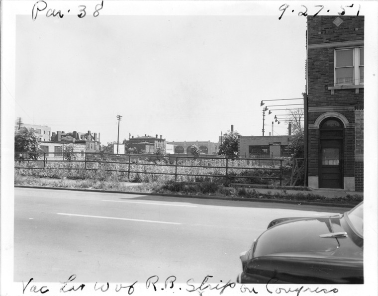 Vacant lot between railroad cut and brick building, parcel 38, in the area bounded by Hastings/Dequindre/Larned/Congress, site 3-S-1. Metal pipe fence along lot; metal lamps project from two-story brick building over billboard. Handwritten on front: "Par. 38, vac. lot W. of R.R. strip on Congress, 9-27-51."