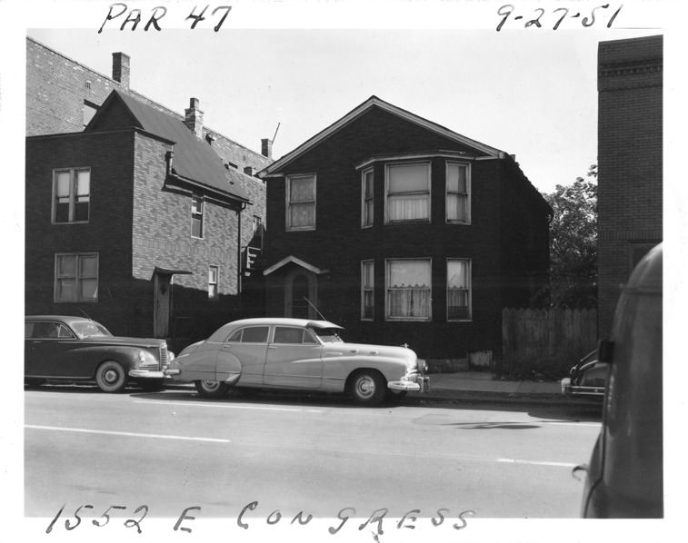 Two-story house with simulated brick siding, possibly duplex, located at 1552 E. Congress, parcel 47, in the area bounded by Hastings/Dequindre/Larned/Congress, site 3-S-1. Bay windows on both floors; two entrances. Brick buildings on both sides. Cars parked on street. Handwritten on front: "Par. 47, 1552 E. Congress, 9-27-51."