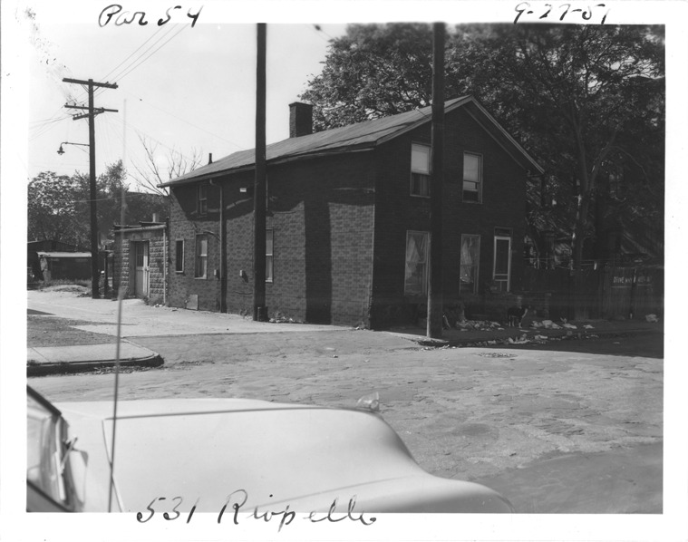 One and a half-story house with simulated brick siding located at 531 Riopelle, parcel 54, in the area bounded by Hastings/Dequindre/Larned/Congress, site 3-S-1. Alley along house; concrete block garage behind house. Car parked on street. Handwritten on front: "Par. 54, 531 Riopelle, 9-27-51."
