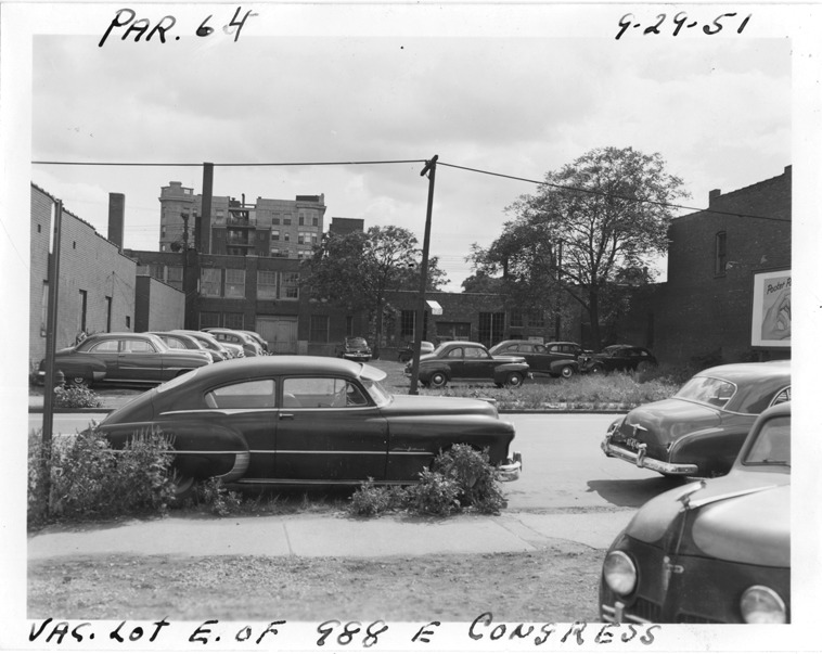 Weed-grown lot viewed from across street, parcel 64, in the area bounded by Hastings/Dequindre/Larned/Congress, site 3-S-1. Brick buildings on both sides and beyond lot; partial billboard for Kleenex pocket packs. Tall brick apartment building visible in background. Cars parked on street and in lot. Handwritten on front: "Par. 64, vac. lot E. of 988 E. Congress, 9-29-51."