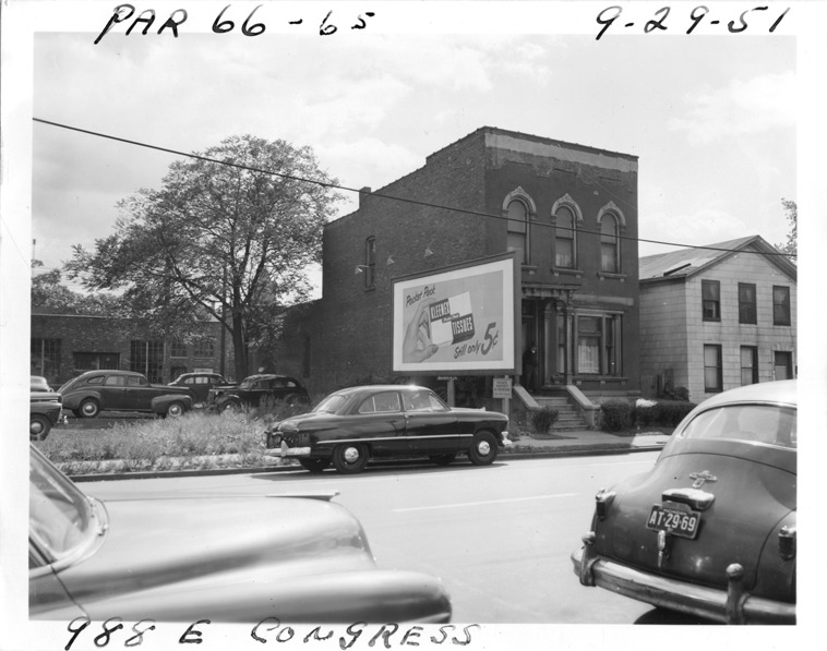 Narrow two-story brick Italianate town house at 988 E. Congress, parcels 66 and 65, in the area bounded by Hastings/Dequindre/Larned/Congress, site 3-S-1. Looks like apartment or rooming house. Tall windows, lace curtains in main floor window, roof stepped toward back; man stands by door. Sign by ornamented front stoop reads "Private property, no trespassing, violators will be prosecuted." Walker & Co. billboard next to house reads "Pocket pack, Kleenex tissues. Still only 5 [cents]." Viewed at an angle across street. Vacant lot on left and wooden-frame house on right. Cars parked on street and in lot. Handwritten on front: "Par. 66-65, 988 E. Congress, 9-29-51."