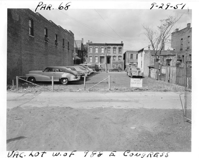 Vacant lot west of 988 and 980 E. Congress, parcel 68, in the area bounded by Hastings/Dequindre/Larned/Congress, site 3-S-1. Viewed from alley to street; houses on right and commercial building on left; houses across street. Sign on fence reads "Private, keep out." Cars and trucks parked on street and in lot. Handwritten on front: "Par. 68, vac. lot W. of 988 E. Congress, 9-29-51."