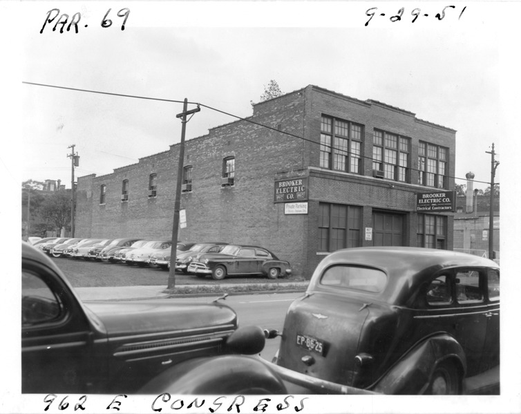 Two-story brick building housing Brooker Electric Co. at 962 E. Congress, parcel 69, in the area bounded by Hastings/Dequindre/Larned/Congress, site 3-S-1. Window air conditioners in upper windows; garage door on front. Signs on building read "Brooker Electric Co. Inc., electrical contractors," "Private parking, visitors and employees only," "Wait here for signal." Cars parked on street and in lot. Handwritten on front: "Par. 69, 962 E. Congress, 9-29-51."