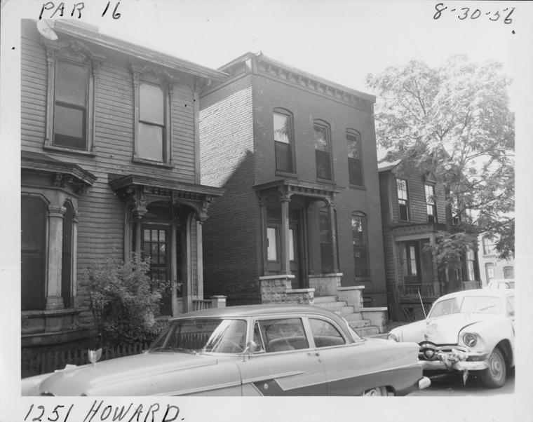 View at angle of two-story brick house with flat roof located at 1251 Howard, parcel 16, in Corktown. Automobiles parked in street. Handwritten on front: "Par. 16, 1251 Howard St., 8-30-56."