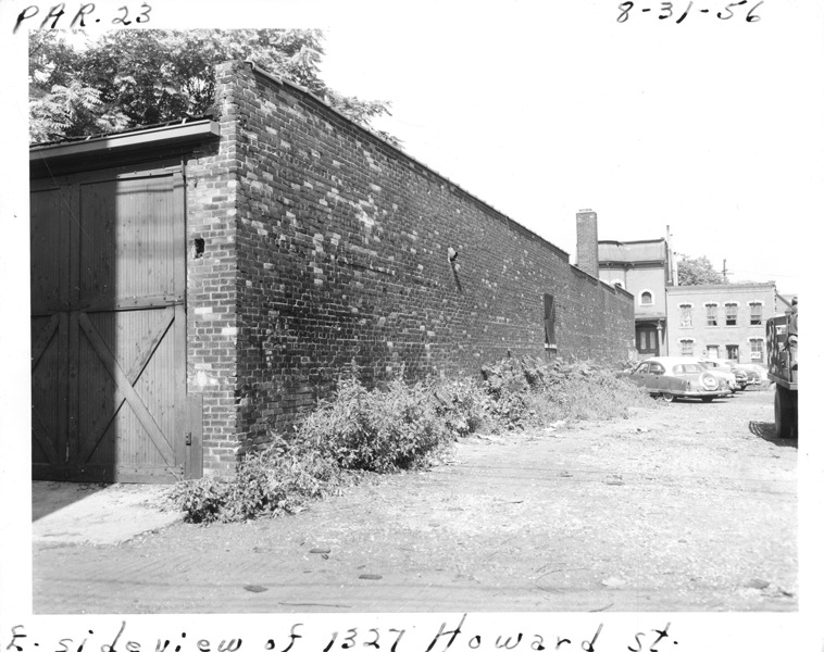 Side view of one-story brick building located at 1327 Howard, parcel 23, in Corktown. Wooden garage doors on building; partial view of adjacent empty lot. Automobiles and truck parked in lot. Handwritten on front: "Par. 23, E. side view of 1327 Howard St., 8-31-56."