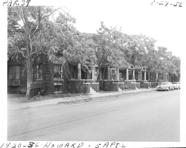 View at an angle of two-story brick row houses located at 1420-1436 Howard, parcel 37, in Corktown. Houses have covered entry porches; houses are partially obscured by trees. Handwritten on front: "Par. 37, 1420-1436 Howard, 5 apts., 8-29-56."
