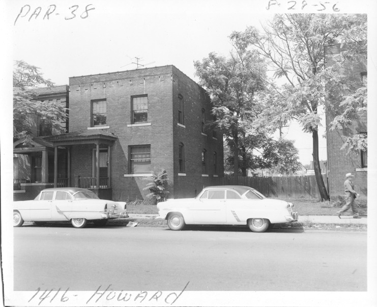 View of two-story brick house with flat roof located at 1416 Howard, parcel 38, in Corktown. Automobiles parked in street. Handwritten on front: "Par. 38, 1416 Howard, 8-29-56."