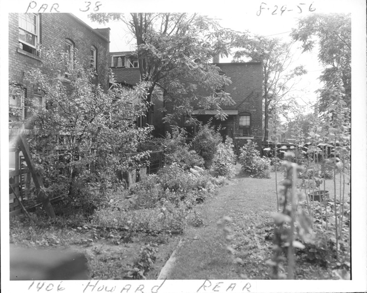 Rear view of two-story brick house with flat roof located at 1406 Howard, parcel 38, in Corktown. Large garden in backyard. Handwritten on front: "Par. 38, 1406 Howard, rear, 8-29-56."