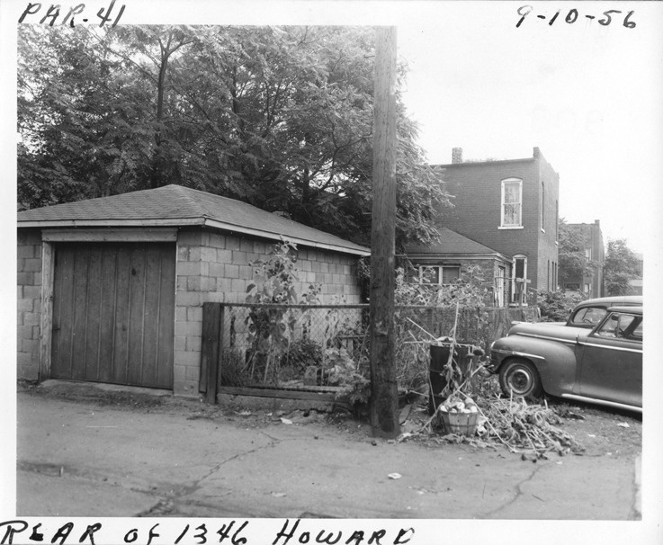 View of concrete block garage located at the rear of 1346 Howard, parcel 41, in Corktown. Two-story brick house in background; sunflowers grow behind fence; trash barrel and bushel basket next to alley. Handwritten on front: "Par. 41, rear of 1346 Howard, 9-10-56."