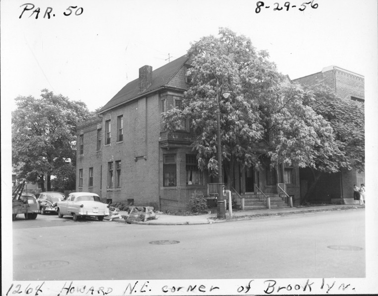 Front and side view of two-story front-gabled brick house located at 1264 Howard, at the northeast corner of Brooklyn, parcel 50, in Corktown. House is partially obscured by trees. Handwritten on front: "Par. 50, 1264 Howard N.E. corner of Brooklyn, 8-29-56."