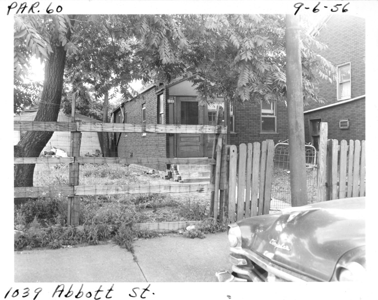 View of one-story house with simulated brick siding located at 1039 Abbott, parcel 60, in Corktown. Fence in front of property; house is partially obscured by trees. Handwritten on front: "Par. 60, 1039 Abbott St., 9-6-56."