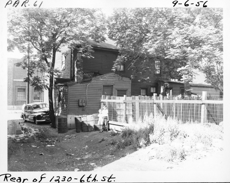 Rear view of two-story wooden-frame house located at 1230 6th St., parcel 61, in Corktown. Two children pose in front of trash barrels and fence bordering backyard. Handwritten on front: "Par. 61, rear of 1230 6th St., 9-6-56."