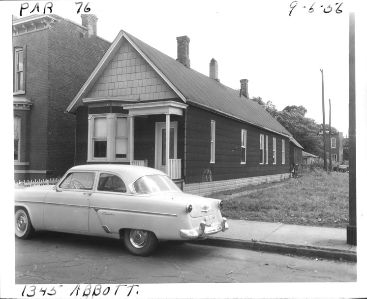 Front and side view of one-story front-gabled house with shingle siding located at 1345 Abbott, parcel 76, in Corktown. Car parked in street. Handwritten on front: "Par. 76, 1345 Abbott, 9-6-56."
