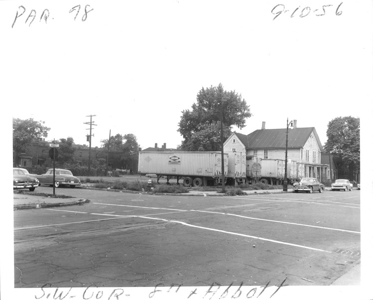 View from across intersection of lot located on the southwest corner of 8th St. and Abbott, parcel 78, in Corktown. Keeshin Transport System truck trailers parked in lot. Handwritten on front: "Par. 78, S.W. cor. 8th & Abbott, 9-10-56."