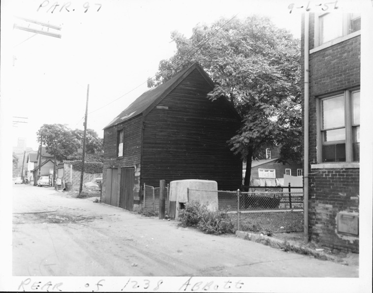 Front and side view from alley of two-story wooden-frame garage located at the rear of 1238 Abbott, parcel 97, in Corktown. Handwritten on front: "Par. 97, rear of 1238 Abbott, 9-6-56."