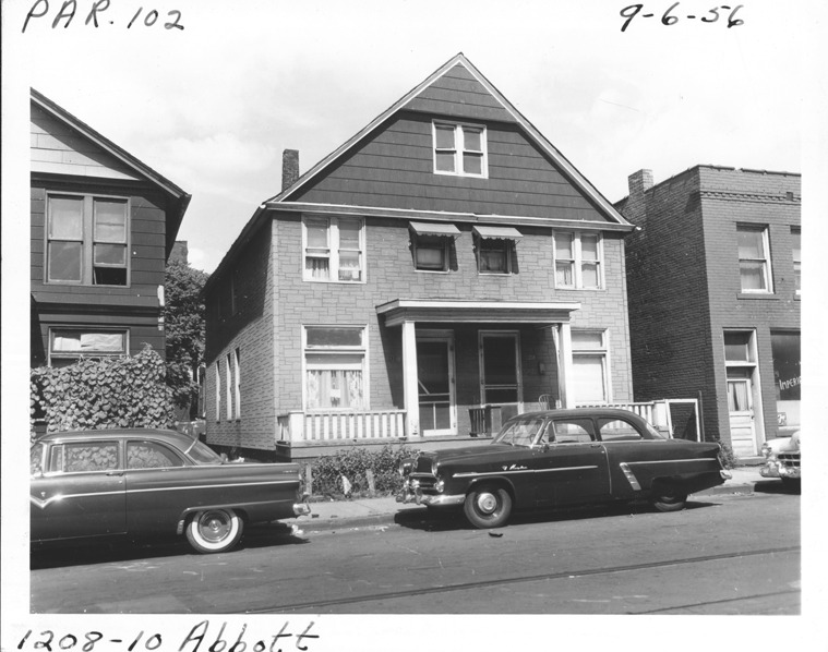 View of two-story front-gabled house with simulated stone siding and covered entry porch, possibly a duplex, located at 1208-1210 Abbott, parcel 102, in Corktown. House has two front entrances; cars parked in street. Handwritten on front: "Par. 102, 1208-10 Abbott, 9-6-56."