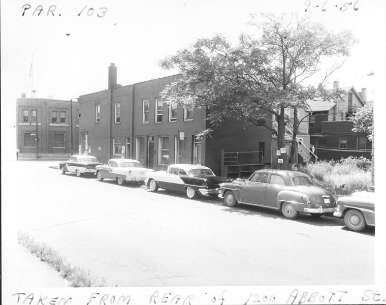 Side and rear view of two-story brick building located at 1200 Abbott, parcel 103, in Corktown. Row of cars parked in street; empty shelving unit rests against back wall of building. Handwritten on front: "Par. 103, taken from rear of 1200 Abbott St., 9-6-56."