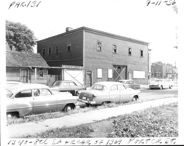 View of two-story building with tar paper siding located at 1340 8th St. and partial view of small wooden-frame house located at the rear of 1369 Porter, parcel 131, in Corktown. Lower windows of building are covered with boards; second level windows are broken. Cars parked in street. Handwritten on front: "Par. 131, 1340 8th St. & rear of 1369 Porter St., 9-11-56."