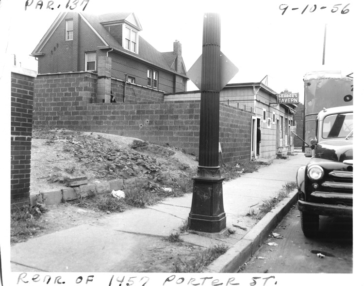 View of one-story concrete block building addition with flat roof located at the rear of 1457 Porter, parcel 137, in Corktown. Sign for George's Tavern on side of building; sidewalk and utility pole in foreground. Handwritten on front: "Par. 137, rear of 1457 Porter St., 9-10-56."