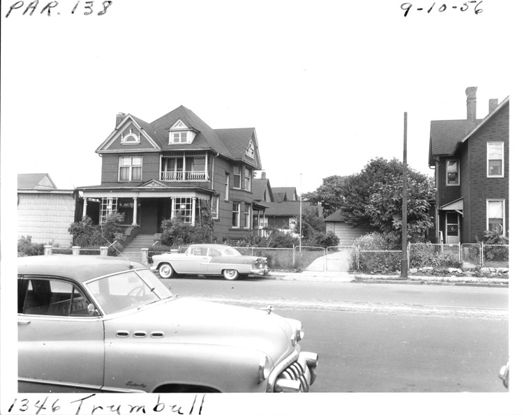View of two-story brick house with covered entry porch located at 1346 Trumbull, parcel 138, in Corktown. Garage and driveway adjacent to house; cars parked in street. Handwritten on front: "Par. 138, 1346 Trumbull, 9-10-56."