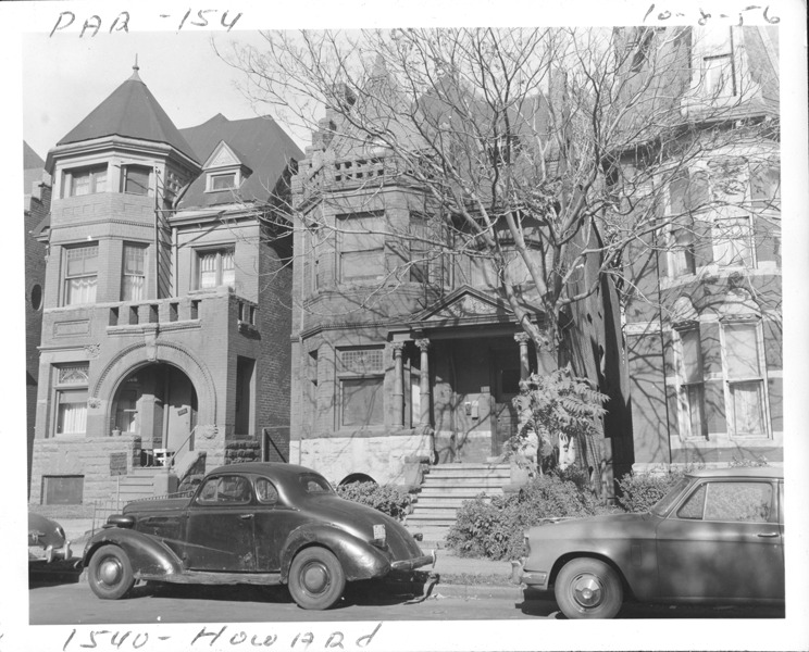 View of two-story Chateauesque style brick house with covered entry porch located at 1540 Howard, parcel 154, in Corktown. House is partially obscured by trees; cars parked in street. Handwritten on front: "Par. 154, 1540 Howard, 10-8-56."