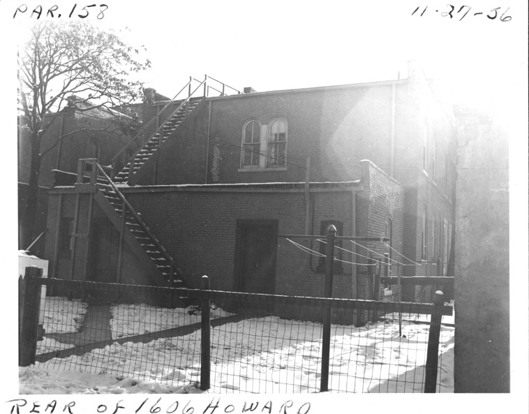 Rear view of two-story brick house located at 1606 Howard, parcel 158, in Corktown. View of back staircase; clothesline in snow-covered backyard. Glare from sunlight in photograph. Handwritten on front: "Par. 158, rear of 1606 Howard, 11-27-56."