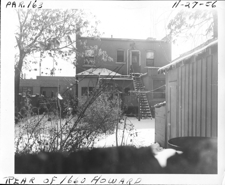 Rear view of two-story brick house with flat roof, possibly an apartment building, located at 1660 Howard, parcel 163, in Corktown. Building has back staircase; backyard is covered with snow. Partial view of garage in foreground. Handwritten on front: "Par. 163, rear of 1660 Howard, 11-27-56."