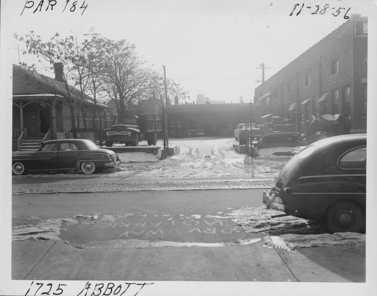 View of lot located at 1725 Abbott, parcel 184, in Corktown. Storage shed in back of lot; car and truck parked in lot. Handwritten on front: "Par. 184, 1725 Abbott, 11-28-56."