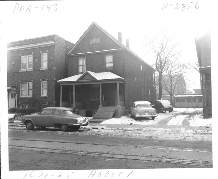 View of two-story front-gabled house with simulated brick siding and covered entry porch located at 1621-1625 Abbott, parcel 193, in Corktown. Cars parked in street and next to house. Handwritten on front: "Par. 193, 1621-25 Abbott, 11-28-56."
