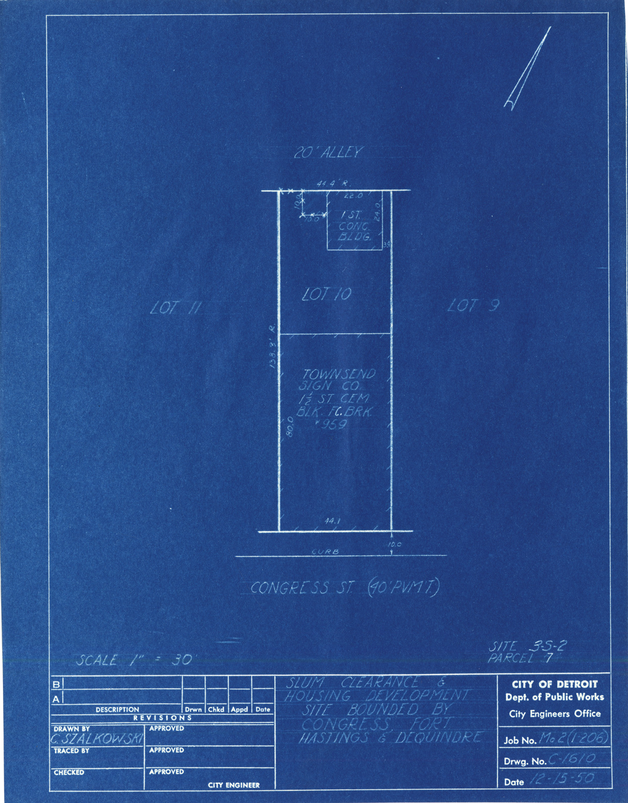 Plot plan for property located on Congress, parcel 7, site 3-S-2. Written on blueprint: "Townsend Sign Co." Recorded on blueprint: "Slum clearance & housing development site bounded by Congress, Fort, Hastings & Dequindre."