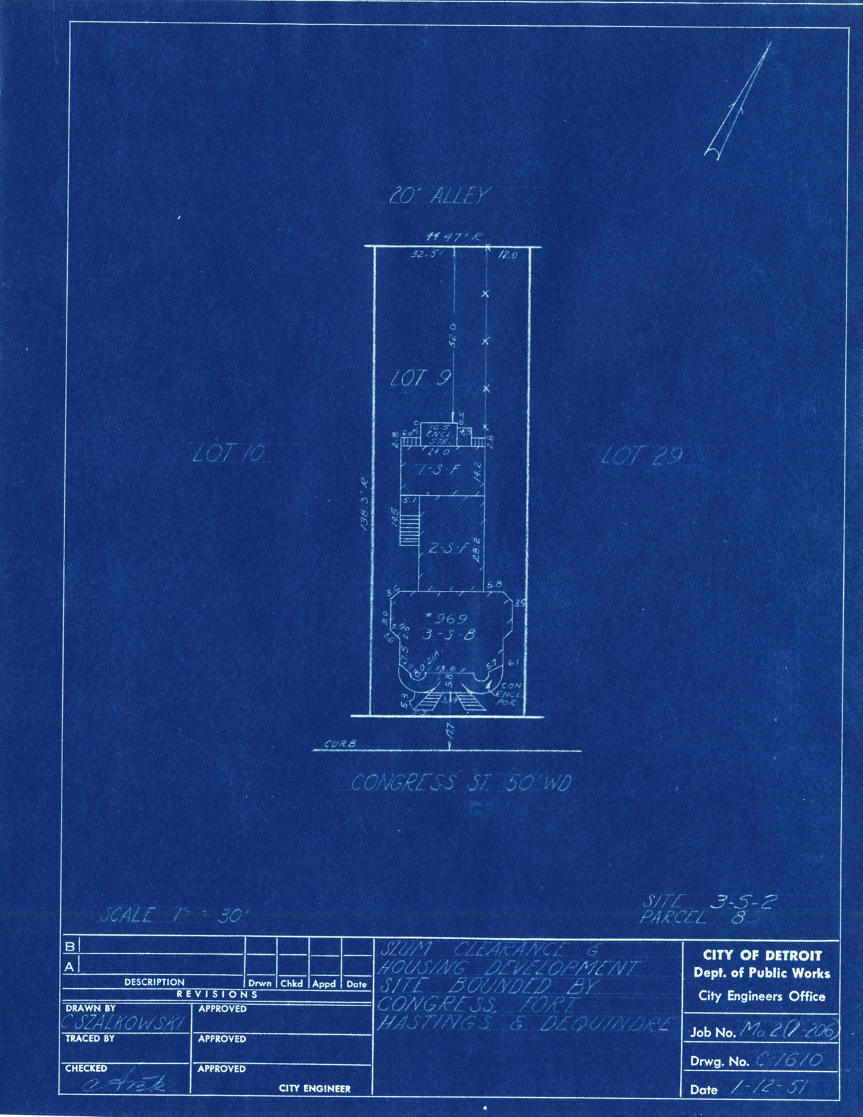 Plot plan for property located on Congress, parcel 8, site 3-S-2. Recorded on blueprint: "Slum clearance & housing development site bounded by Congress, Fort, Hastings & Dequindre."