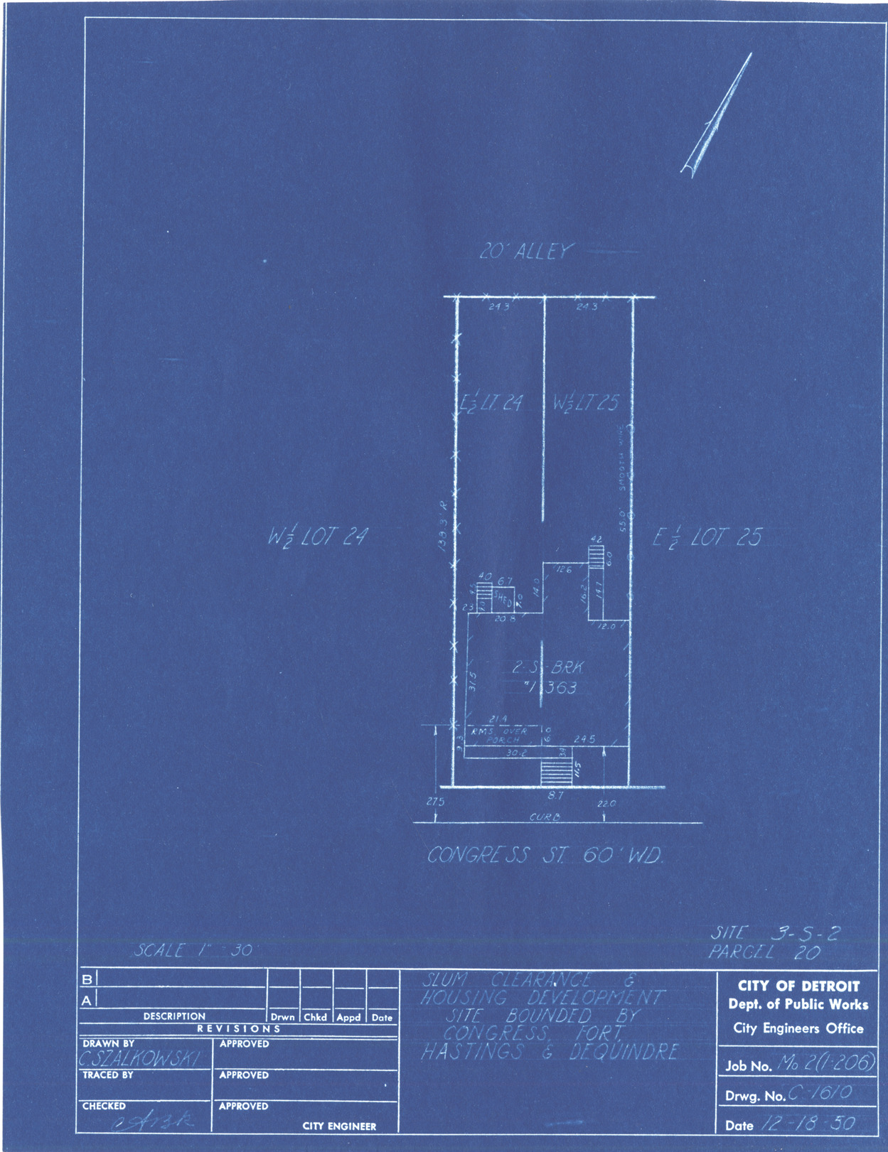 Plot plan for property located on Congress, parcel 20, site 3-S-2. Recorded on blueprint: "Slum clearance & housing development site bounded by Congress, Fort, Hastings & Dequindre."