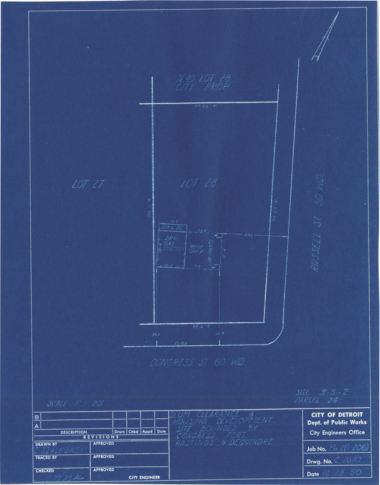 Plot plan for property located on the corner of Congress and Russell, parcel 24, site 3-S-2. Recorded on blueprint: "Slum clearance & housing development site bounded by Congress, Fort, Hastings & Dequindre."