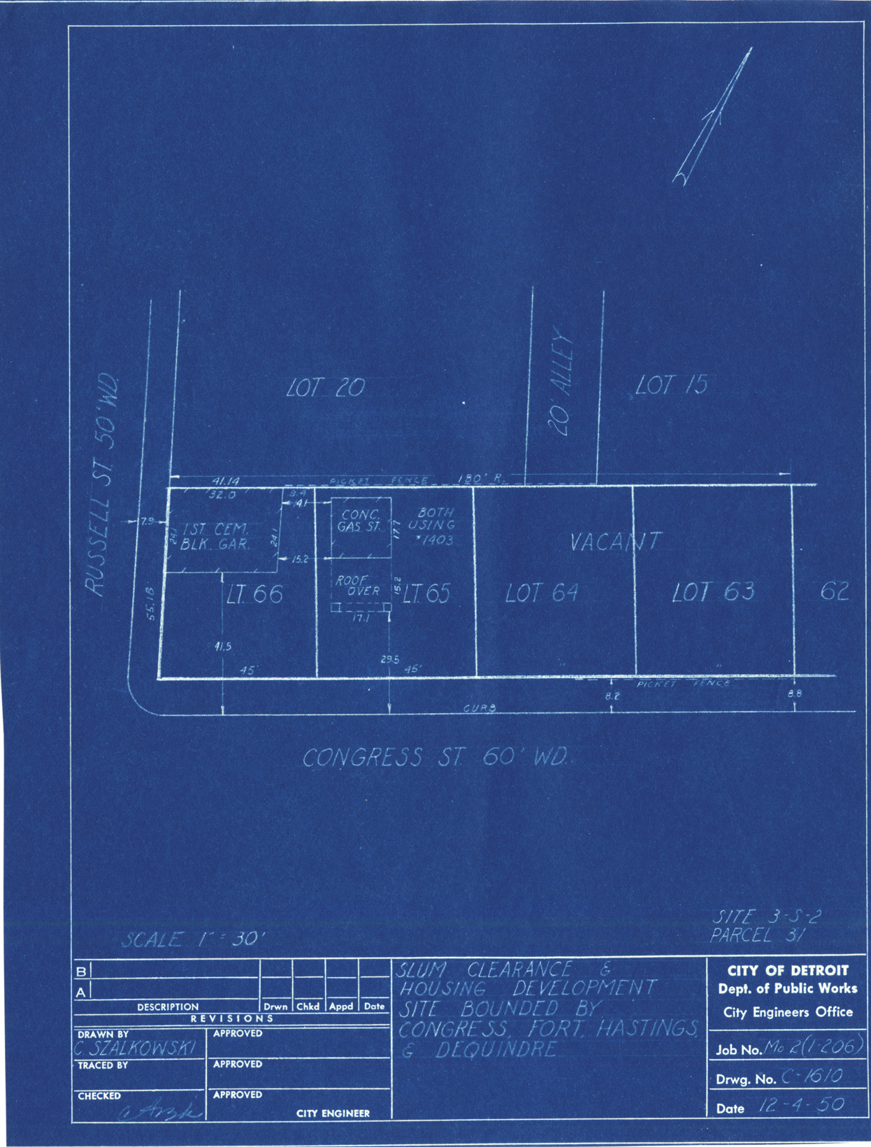 Plot plan for property located on the corner of Congress and Russell, parcel 31, site 3-S-2. Recorded on blueprint: "Slum clearance & housing development site bounded by Congress, Fort, Hastings & Dequindre."