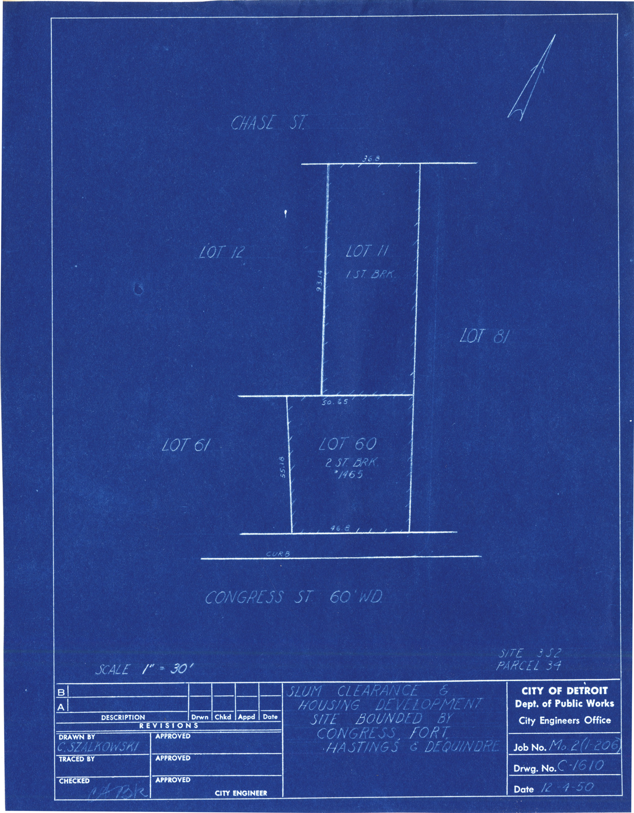 Plot plan for property located on Congress, parcel 34, site 3-S-2. Recorded on blueprint: "Slum clearance & housing development site bounded by Congress, Fort, Hastings & Dequindre."