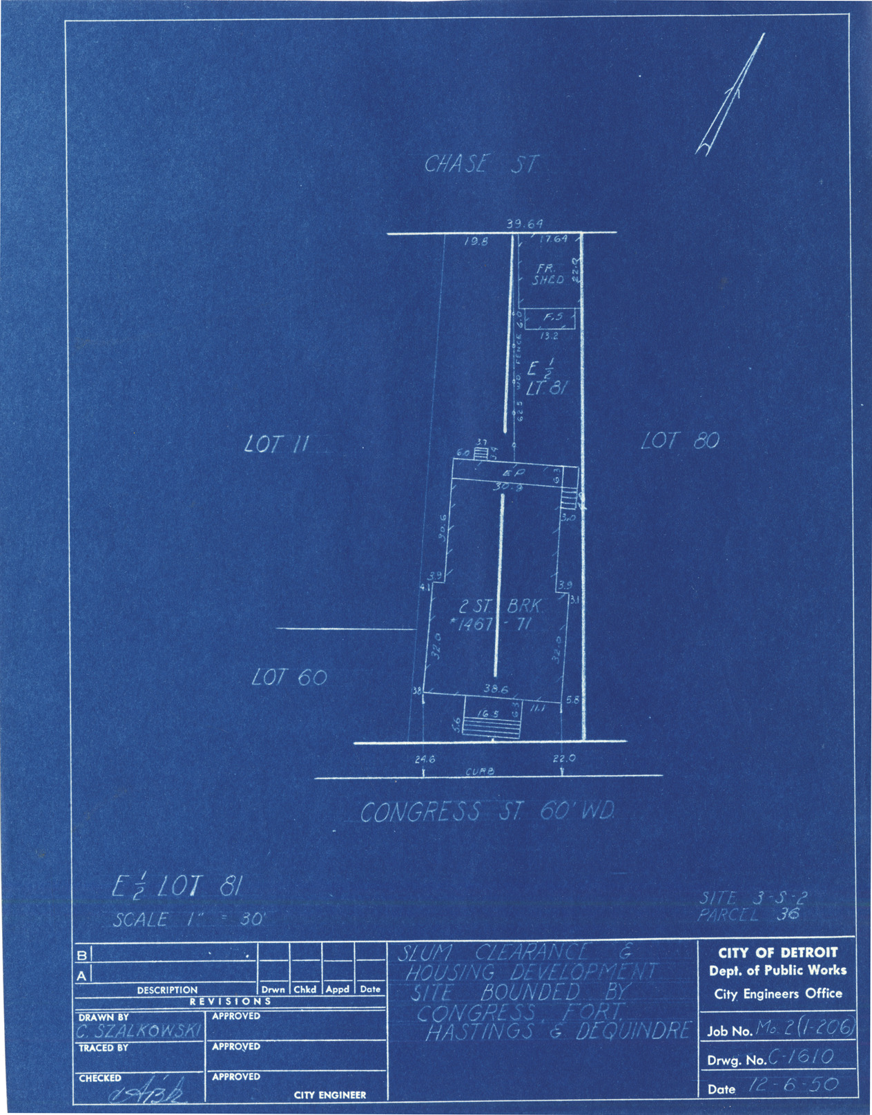 Plot plan for property located on Congress, parcel 36, site 3-S-2. Recorded on blueprint: "Slum clearance & housing development site bounded by Congress, Fort, Hastings & Dequindre."