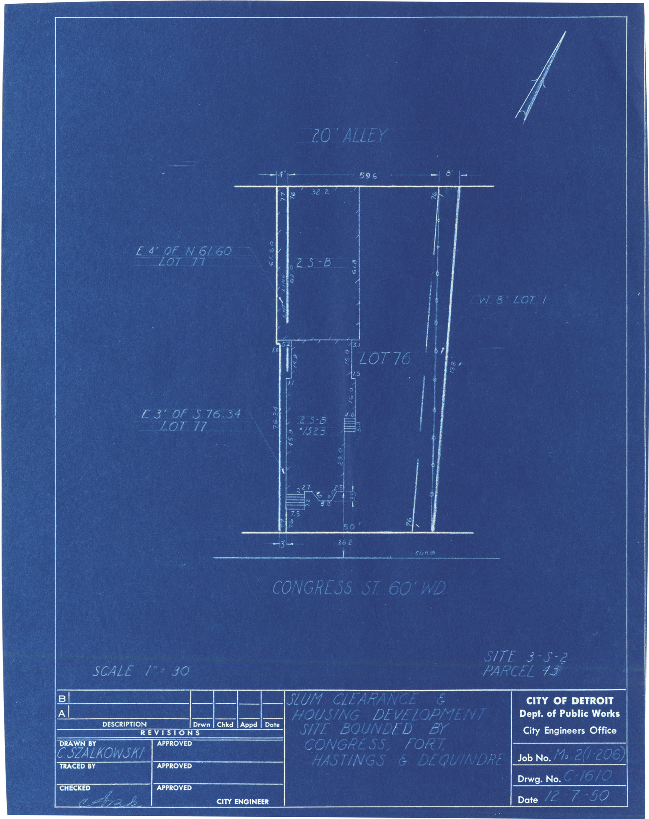 Plot plan for property located on Congress, parcel 43, site 3-S-2. Recorded on blueprint: "Slum clearance & housing development site bounded by Congress, Fort, Hastings & Dequindre."