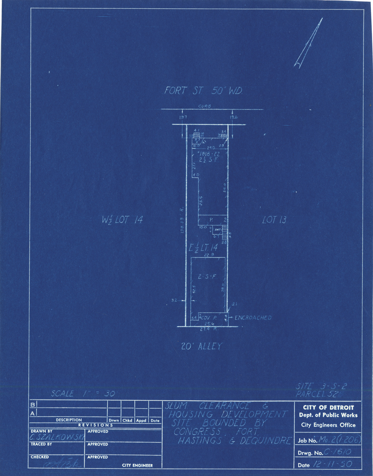 Plot plan for property located on Fort, parcel 52, site 3-S-2. Recorded on blueprint: "Slum clearance & housing development site bounded by Congress, Fort, Hastings & Dequindre."