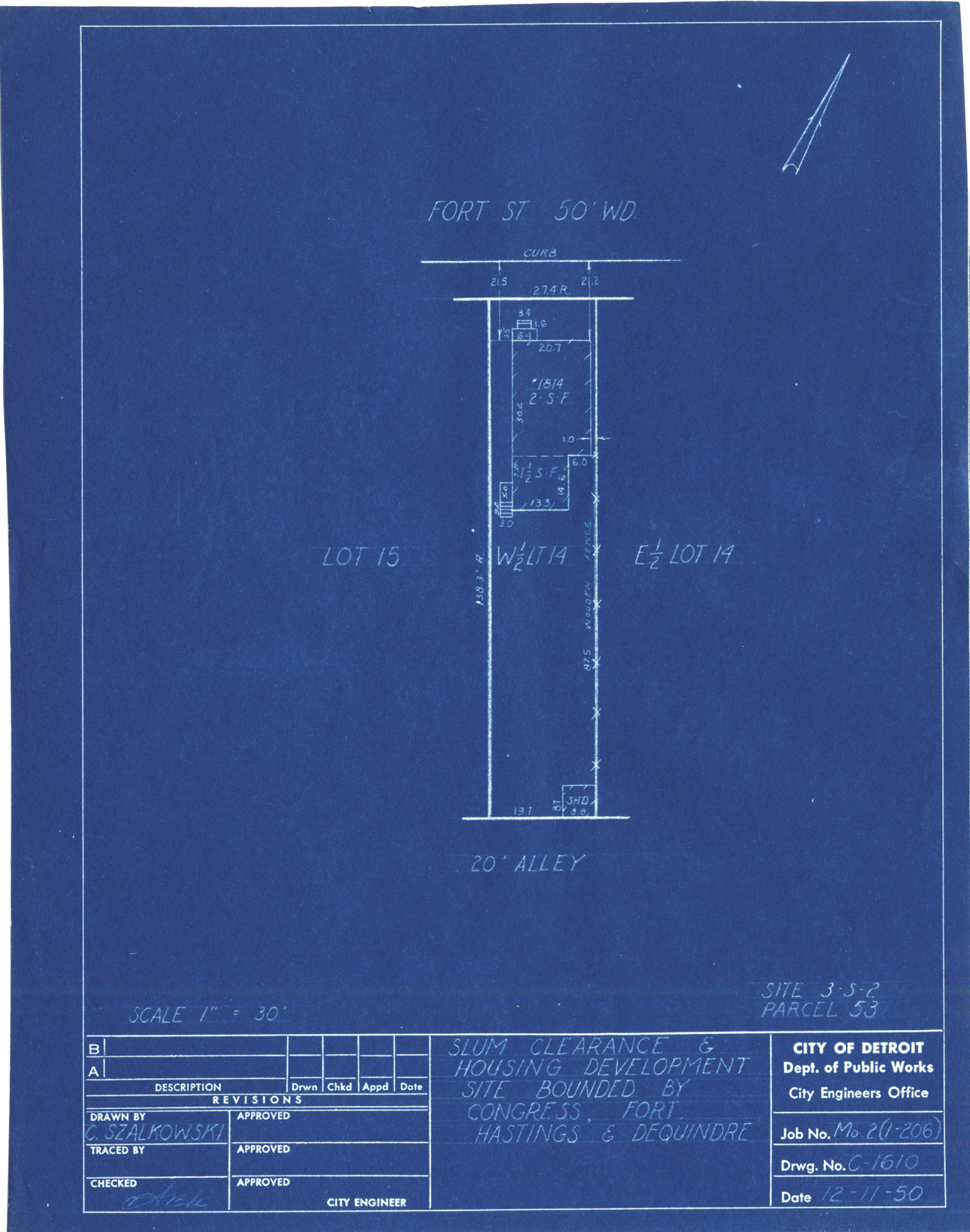 Plot plan for property located on Fort, parcel 53, site 3-S-2. Recorded on blueprint: "Slum clearance & housing development site bounded by Congress, Fort, Hastings & Dequindre."