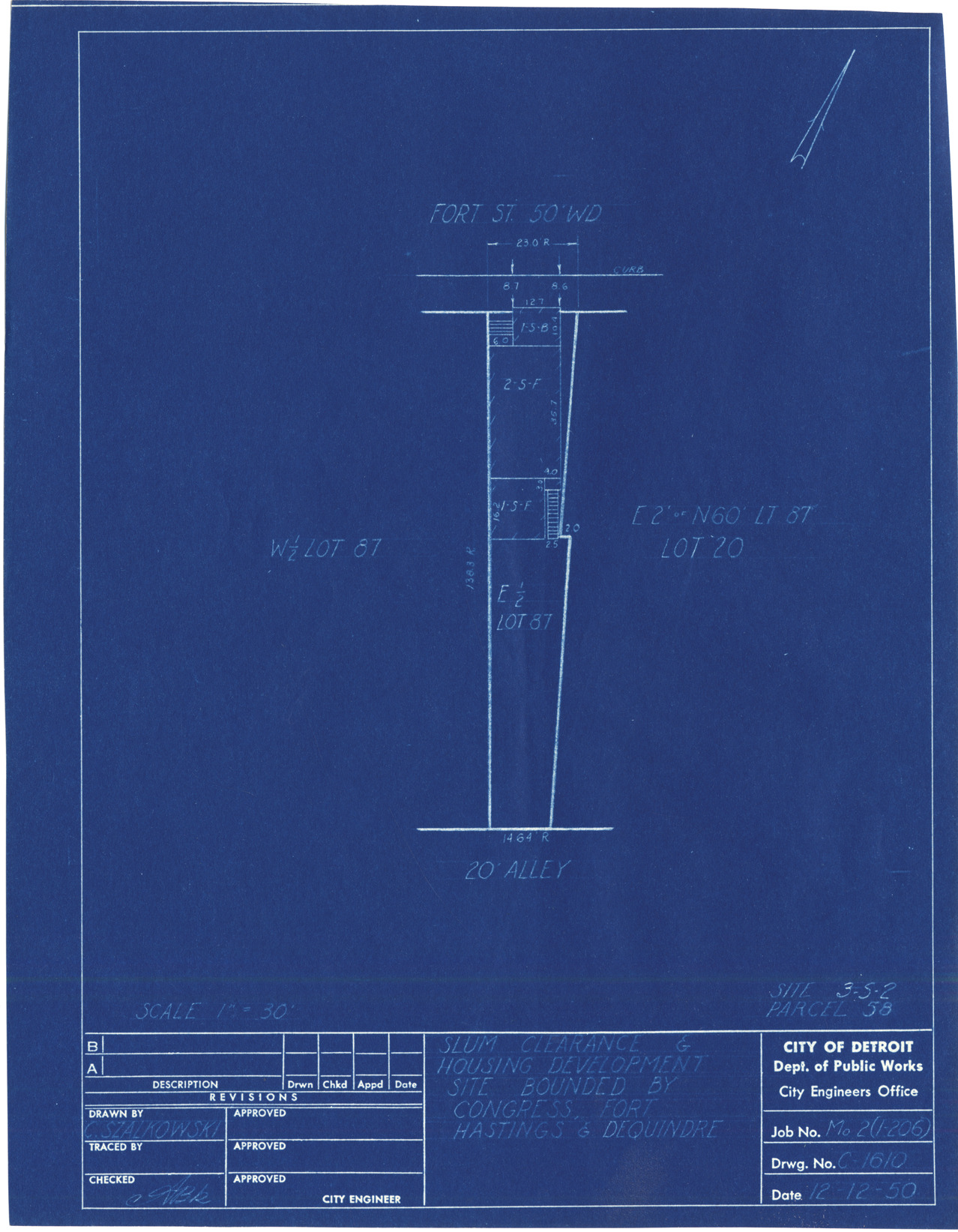 Plot plan for property located on Fort, parcel 58, site 3-S-2. Recorded on blueprint: "Slum clearance & housing development site bounded by Congress, Fort, Hastings & Dequindre."