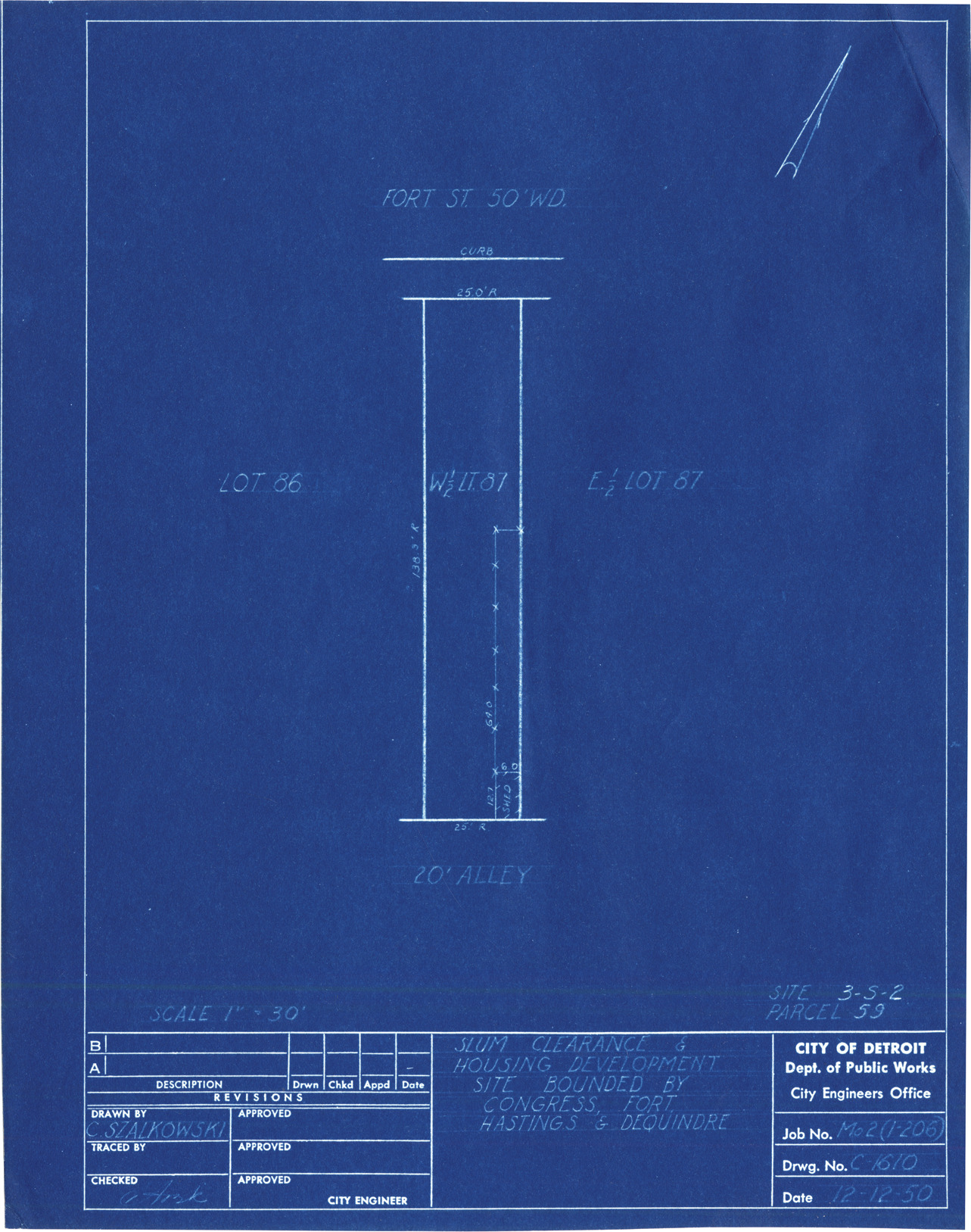 Plot plan for property located on Fort, parcel 59, site 3-S-2. Recorded on blueprint: "Slum clearance & housing development site bounded by Congress, Fort, Hastings & Dequindre."