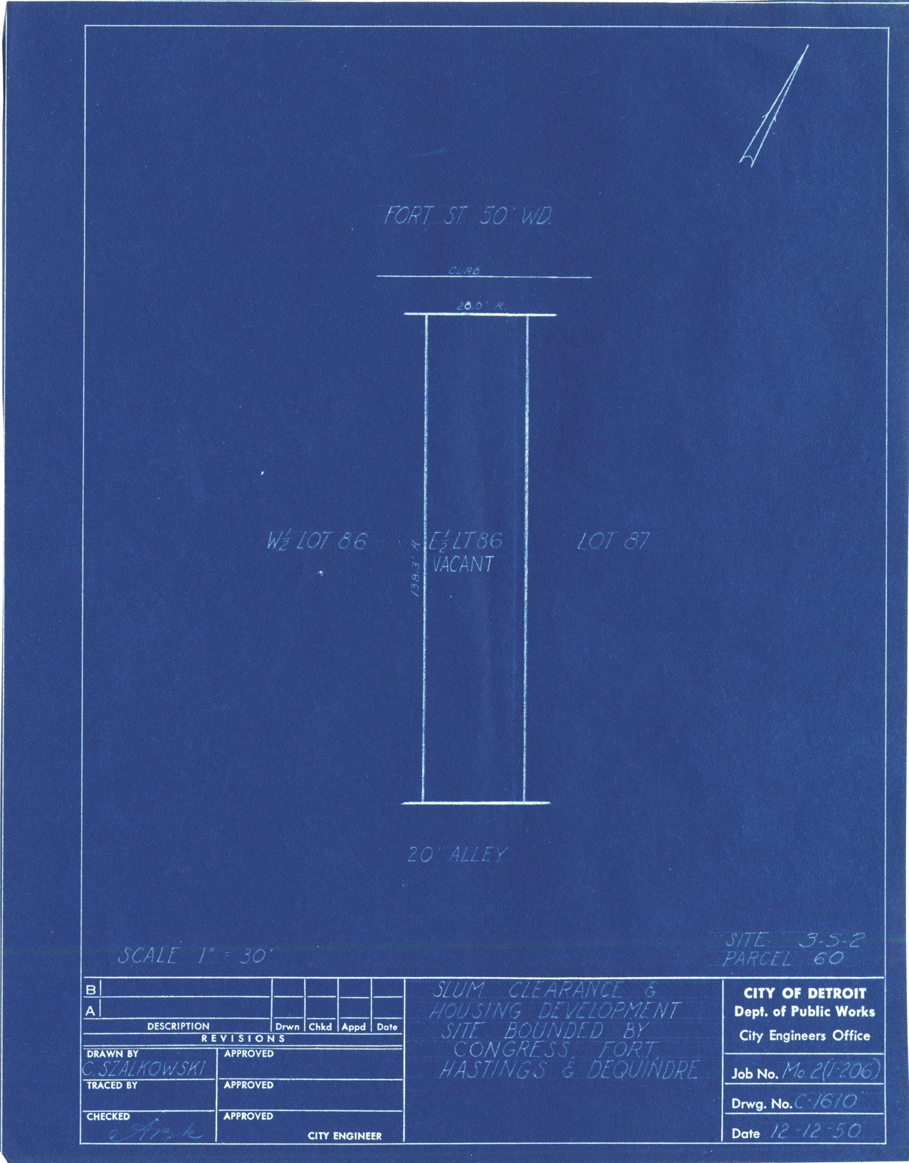 Plot plan for property located on Fort, parcel 60, site 3-S-2. Recorded on blueprint: "Slum clearance & housing development site bounded by Congress, Fort, Hastings & Dequindre."