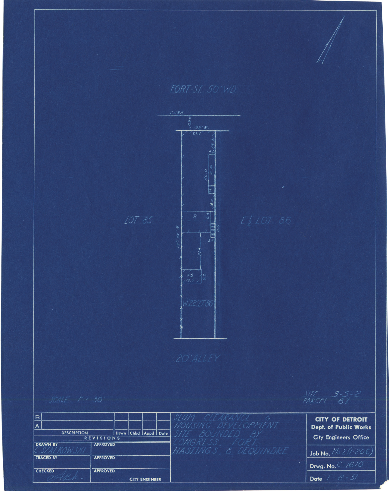 Plot plan for property located on Fort, parcel 61, site 3-S-2. Recorded on blueprint: "Slum clearance & housing development site bounded by Congress, Fort, Hastings & Dequindre."