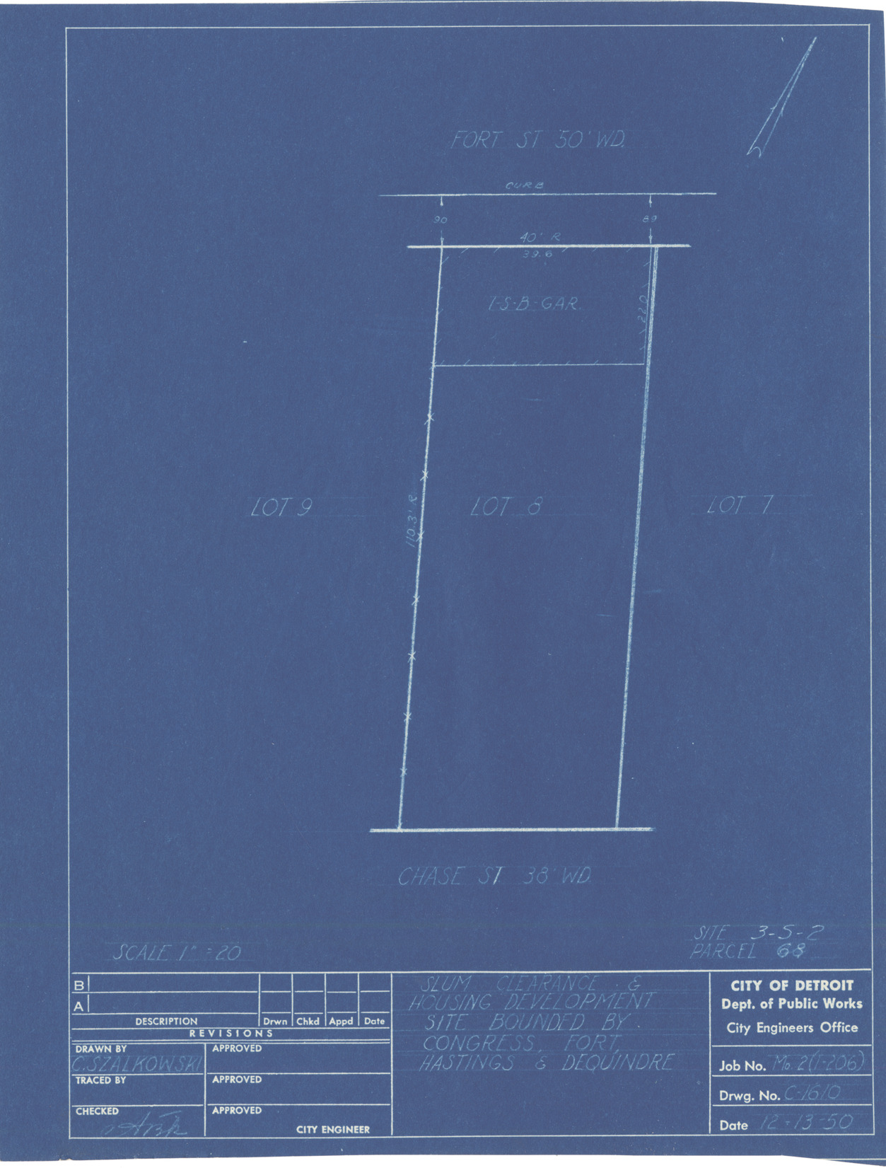 Plot plan for property located on Fort, parcel 68, site 3-S-2. Recorded on blueprint: "Slum clearance & housing development site bounded by Congress, Fort, Hastings & Dequindre."