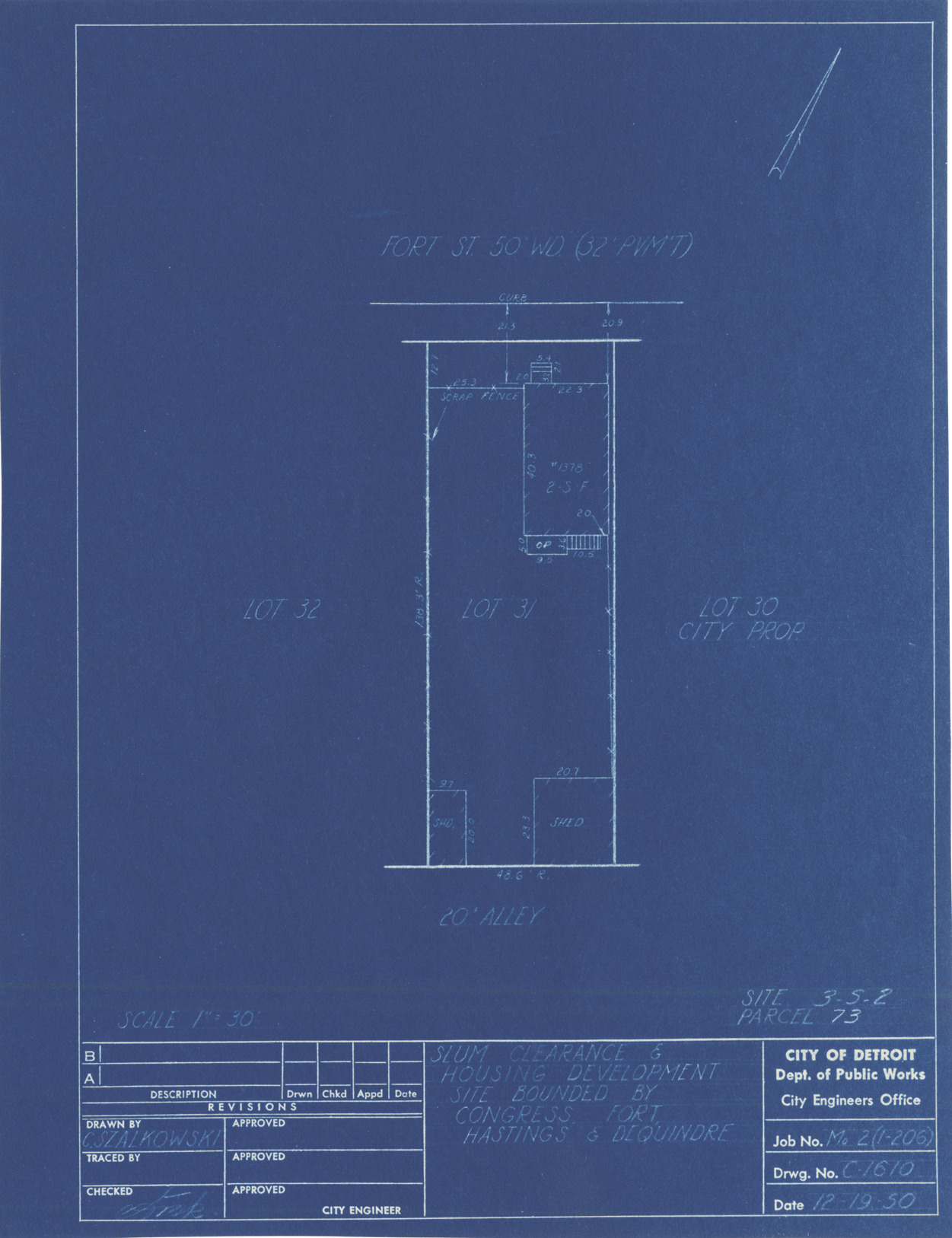 Plot plan for property located on Fort, parcel 73, site 3-S-2. Recorded on blueprint: "Slum clearance & housing development site bounded by Congress, Fort, Hastings & Dequindre."